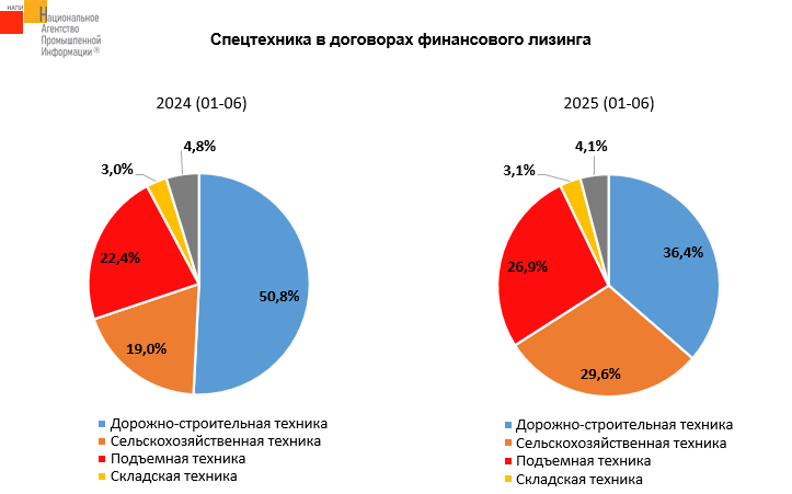 По данным маркетингового агентства НАПИ, за январь-июнь 2025 года в финансовый лизинг было выдано 14,9 тыс. единиц новой и подержанной специализированной техники, что на 46,8% меньше, чем годом ранее, когда было выдано 27,9 тыс. Лизинг дорожно-строительной техники упал на 61,9%, в результате доля этого сегмента за год сократилась с с 50,8% до 36,4%. Выдача в лизинг сельскохозяйственной техники снизилась не так сильно (на 17,4%), поэтому доля этого сегмента выросла на 10,6%.