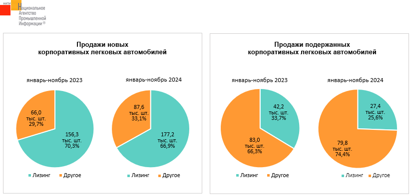 По данным маркетингового агентства НАПИ, за одиннадцать месяцев 2024 года было выдано в финансовый и операционный лизинг 177,2 тыс. новых легковых автомобилей, что на 13,4% больше, чем годом ранее. Продажи новых легковых автомобилей корпоративным клиентам выросли на 19,2%, как результат доля лизинговых автомобилей немного сократилась. Тем не менее, две трети новых легковых автомобилей были приобретены корпоративными клиентами с помощью лизинга. Лизинг подержанных легковых автомобилей в текущем году сократился на 34,9%, только четверть подержанных легковых автомобилей приобреталась клиентами с помощью лизинга.