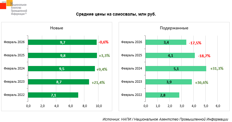В феврале 2026 года средние цены на новые самосвалы снизились на 0,6%, стоимость техники составила 9,7 млн рублей. Средние цены на подержанную технику сократились до 3,4 млн рублей (-17,5%). За четыре года новые самосвалы подорожали на 36,3%, а подержанные – на 20,3%.