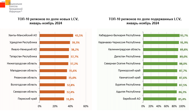 По данным маркетингового агентства НАПИ, за одиннадцать месяцев 2024 года была продана 501 тыс. новых и подержанных легких коммерческих автомобилей (LCV)*, на долю новых автомобилей пришлось 24,8% всех продаж. В тридцати семи регионах доля новых автомобилей была выше, чем в целом по России. Интересно отметить, что в десятку лидеров по доле новых автомобилей не вошли ни Москва, ни Санкт-Петербург.
