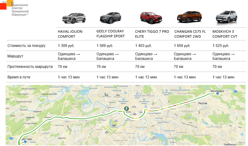 Маркетинговое агентство НАПИ проанализировало стоимость поездки на корпоративном легковом автомобиле из Одинцово в Балашиху. Длительность поездки и маршрут определены в соответствии с дорожной ситуацией на момент расчета, длина маршрута составила 70 км. Затраты на поездку учитывают все затраты при владении автомобилем в течении 5 лет и актуальные цены на топливо на момент расчета маршрута. Зарплата водителя в расчет не входит. Экономичнее для корпоративного владельца проехать по заданному маршруту на HAVAL JULION COMFORT.