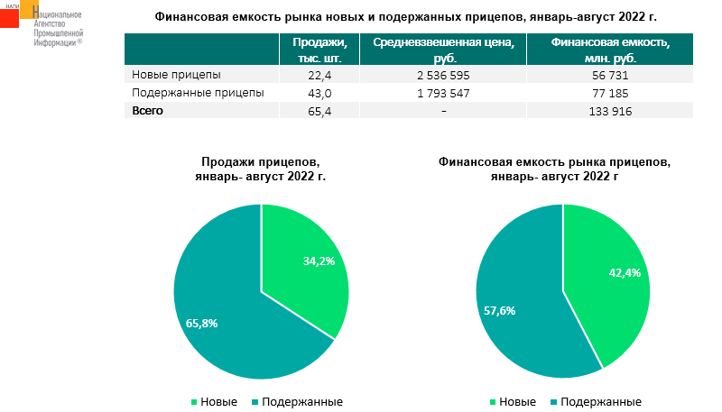 По данным маркетингового агентства НАПИ (Национальное Агентство Промышленной Информации) на покупку новой и подержанной прицепной техники за восемь месяцев 2022 года было потрачено 133,9 млрд. руб. На долю новых прицепов пришлось 42,4% от этой суммы, при этом доля новой техники в структуре продаж «в штуках» составила чуть больше трети. По финансовым показателям на рынке новой техники лидирует ТОНАР, на рынке подержанной - SCHMITZ.