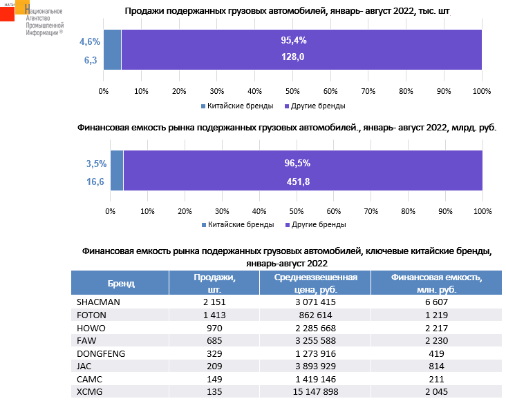 По данным маркетингового агентства НАПИ (Национальное Агентство Промышленной Информации) на покупку подержанных китайских грузовых автомобилей за восемь месяцев текущего года было потрачено 16,6 млрд. руб. Доля китайских брендов в структуре финансовой емкости рынка подержанных автомобилей и в структуре продаж «в штуках» пока не велика – 3,5% и 4,6 % соответственно. Лидером среди китайских брендов по продажам «в штуках» и «в деньгах», как и на рынке новых грузовых автомобилей, стал SHACMAN.