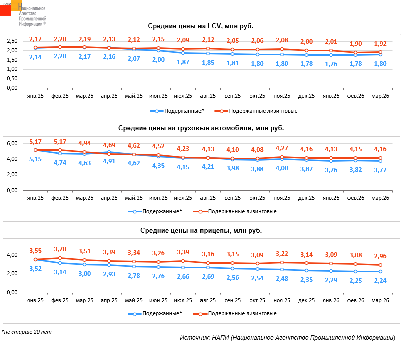 За год, с марта 2025 года по март 2026 года, средние цены на подержанные LCV** сократились на 17,2%, а лизинговые цены – на 12,5%. Аналогично средние цены на грузовые*** автомобили снизились на 18,5%, лизинговые цены – на 15,8%. Стоимость прицепной техники за год стала ниже на 25,5%, а стоимость прицепов от лизинговых компаний – на 15,7%.