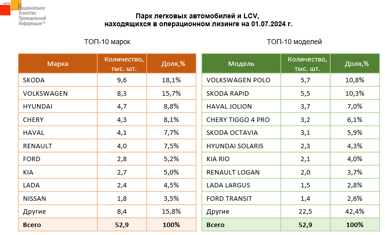 По данным маркетингового агентства НАПИ, парк легковых и легких коммерческих автомобилей (LCV), находящихся в операционном лизинге на 01.07.2024 г., насчитывает 52,9 тыс. шт. На долю китайских брендов приходится 22,7% парка автомобилей, находящихся в операционном лизинге. Тем не менее, пока еще лидирующим брендом остается SKODA, а самым популярным автомобилем - VOLKSWAGEN POLO.