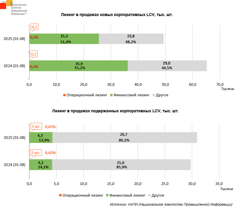 На долю финансового лизинга в продажах новых LCV в январе-августе 2024 года приходилось 55,2%, в аналогичный период 2025 года доля сократилась до 51,4%. На долю финансового лизинга в продажах подержанных LCV в 2024 году приходилось 14,1%, в текущем году она снизилась до 13,9%. В операционный лизинг в январе-августе 2024 и 2025 года было взято по 0,2 тыс. единиц новых LCV и лишь по 5 единиц подержанных.