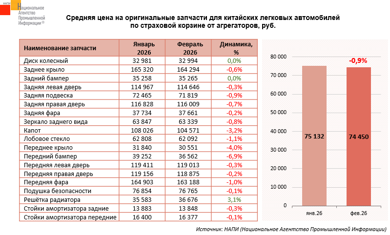 Маркетинговое агентство НАПИ проанализировало цены на оригинальные запчасти по страховой корзине для китайских легковых автомобилей от агрегаторов. За месяц, с января по февраль 2026 года, средняя цена сократилась на 0,9% до 74,5 тыс. рублей.