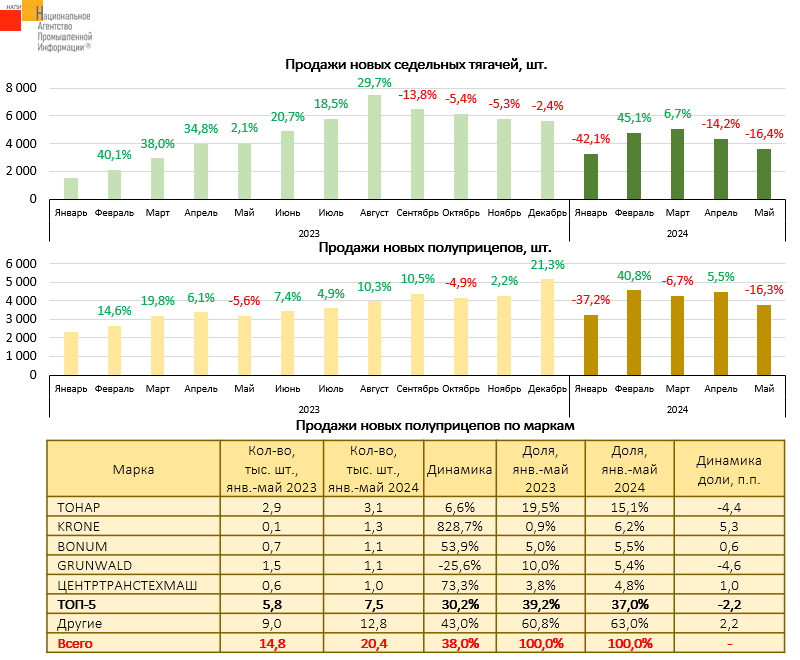 По данным маркетингового агентства НАПИ продажи новых полуприцепов за пять месяцев текущего года выросли на 38%. Интересно отметить, что по итогам пяти месяцев прошлого года продажи новых полуприцепов (14,8 тыс.) немного превысили продажи новых тягачей (14,6 тыс.). В текущем году тягачей было продано чуть больше, чем полуприцепов, 21,1 тыс. шт. против 20,4 тыс. шт. По итогам января-мая 2024 года второе место на российском рынке заняли полуприцепы KRONE, продажи которых выросли на рекордные 828,7%.