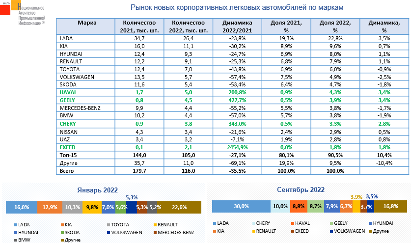 Согласно данным НАПИ (Национальное Агентство Промышленной Информации) за девять месяцев 2022г. корпоративные клиенты приобрели 116,0 тыс. новых легковых автомобилей, что на 35,5% меньше, чем в прошлом году. За девять месяцев 2021 года корпоративным клиентам было продано 179,7 тыс. новых легковых автомобилей. В сентябре текущего года лидерами китайских брендов стали - CHERY , HAVAL, GEELY.