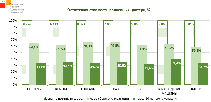 Маркетинговое агентство НАПИ (Национальное Агентство Промышленной Информации) обновило отчет «Остаточная стоимость прицепной техники» по итогам 3 квартала 2024 г. Среди представленных на графике прицепных цистерн лидером по сохранности остаточной стоимости через 5 лет эксплуатации стала техника ГРАЗ. Так, продав пятилетнею цистерну ГРАЗ, владелец мог приобрести новую, доплатив 33,5% от ее цены в 3 квартале 2024 г. Через 10 лет эксплуатации лидировали «Вологодские Машины» с остаточной стоимостью прицепных цистерн в 39,4%.