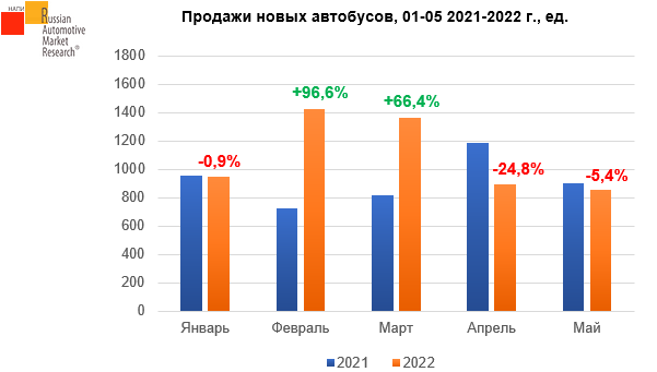 Согласно данным НАПИ/Russian Automotive Market Research по итогам пяти месяцев 2022 г. продажи новых автобусов выросли на 19,5% по сравнению с прошлым годом. За пять месяцев текущего года было продано 5,5 тыс. новых автобусов, в прошлом году – 4,6 тыс. Столь существенный рост продаж произошел за счет рекордных показателей в феврале и марте 2022 г. Сильнее всего рынок новых автобусов сократился в апреле текущего года.