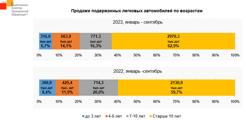 По данным маркетингового агентства НАПИ, на рынке подержанных легковых автомобилей наибольшим спросом пользуются машины старше 10 лет. Продажи таких возрастных автомобилей за девять месяцев 2023 года выросли на 39,4%, тогда как весь рынок подержанных машин – на 32,2%. Продажи «свежих» подержанных (возрастом до 3 лет включительно) выросли всего на 5%, что объясняется с одной стороны дефицитом подобных автомобилей на российском рынке. С другой стороны, владельцы «свежих» подержанных машин не спешат их продавать, т.к. взамен привычных иномарок придется покупать новые китайские автомобили по ценам, за которые 3 года назад можно было купить европейский, японский, корейский автомобиль в хорошей комплектации.