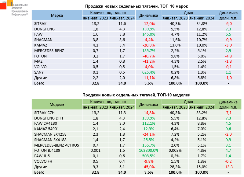 По данным маркетингового агентства НАПИ, продажи новых седельных тягачей по итогам восьми месяцев 2024 г. выросли на 3,6%, тогда как весь рынок новых грузовых автомобилей сократился на 9,9%. Доля тягачей на рынке новых грузовых автомобилей за год увеличилась с 35,4% до 40,7%. В десятку лидирующих моделей вошли два «европейца» - MERCEDES-BENZ ACTROS и VOLVO FH.