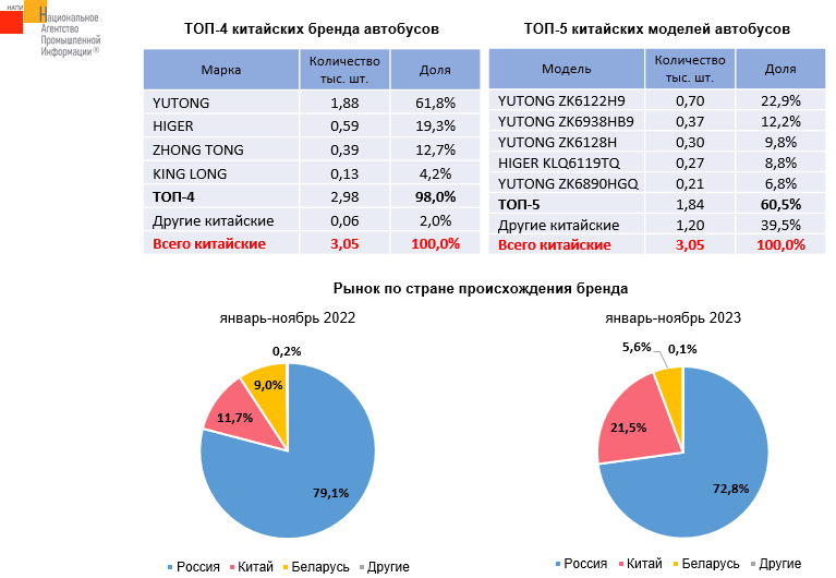 По данным маркетингового агентства НАПИ, продажи новых китайских автобусов за 11 месяцев 2023 года выросли на 141,7%, тогда как весь рынок вырос на 31,6%. Доля автобусов китайских брендов в текущем году достигла 21,5%. Лидером на рынке китайских автобусов стал YUTONG.