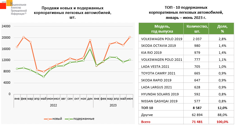 По данным маркетингового агентства НАПИ, за первое полугодие 2023 г. продажи новых корпоративных легковых автомобилей выросли на 16,9%, тогда как продажи подержанных – на 45%. По итогам первого полугодия корпоративные клиенты приобрели 95,1 тыс. новых легковых автомобилей и 71,5 тыс. подержанных. Самым популярным подержанным автомобилем у корпоративных клиентов стал VOLKSWAGEN POLO 2019 года выпуска. Интересно отметить, что в десятку лидеров вошли только автомобили 2019 и 2021 годов выпуска.