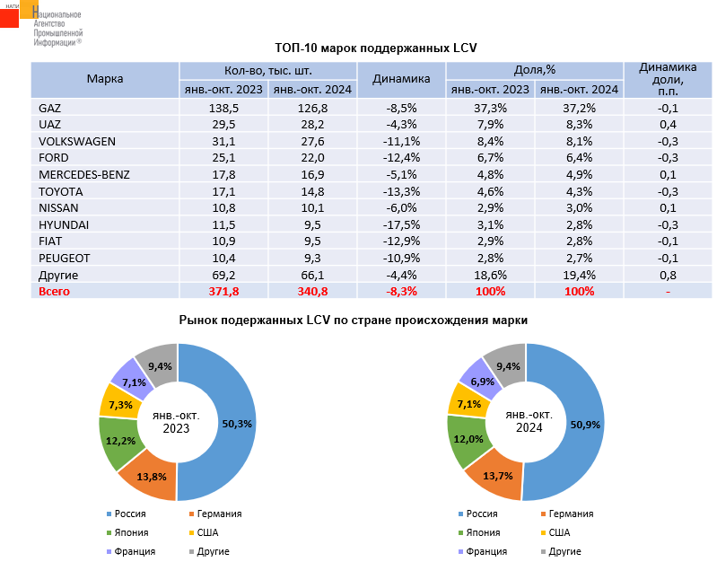 По данным маркетингового агентства НАПИ, продажи подержанных легких коммерческих автомобилей (LCV)* за десять месяцев 2024 года снизились на 8,3%. Структура рынка за год почти не изменилась, на долю российской техники приходится чуть больше половины всех проданных подержанных LCV . На втором месте по популярности – немецкие легкие коммерческие автомобили.