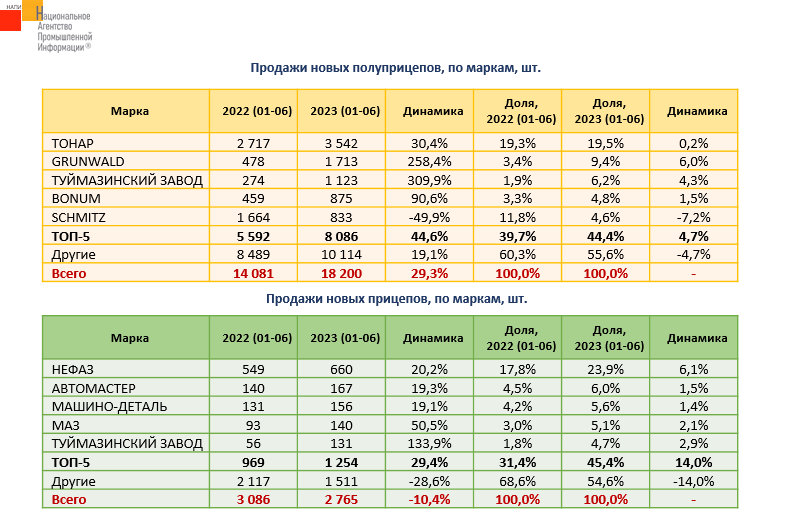 По данным маркетингового агентства НАПИ в первом полугодии 2023 г. продажи новых полуприцепов выросли на 29,3%, тогда как продажи новых прицепов сократились на 10,4%. На рынке полуприцепов лидером остался Тонар, доля которого практически не изменилась. На рынке прицепов лидер также остался прежним – НЕФАЗ, который занял почти четверть рынка.