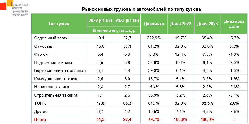Маркетинговое агентство НАПИ проанализировало структуру рынка новых грузовых автомобилей. По итогам восьми месяцев 2023 года продажи тягачей превысили продажи самосвалов и заняли 35,4% рынка. Тем не менее на самосвалы приходится почти треть рынка новых грузовиков. Значительно снизилась доля фургонов – на 4,9%, продажи которых росли существенно ниже рынка.