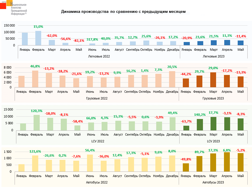 По данным маркетингового агентства НАПИ, за 5 месяцев текущего года было произведено 172 тыс. легковых автомобилей (-35,9% к пяти месяцам 2022 г.), 24,1 тыс. грузовиков (-7,6%), 39,5 тыс. LCV ( +6,6%), 6 тыс. автобусов (+37%). Апрель-май прошлого года были самыми тяжелыми месяцами, впоследствии производство начало восстанавливаться. Будет интересно сравнить показатели второго полугодия текущего и предыдущего года и оценить результаты восстановления.