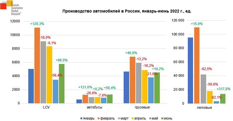 Согласно данным НАПИ (Национальное Агентство Промышленной Информации), за шесть месяцев 2022 г. было произведено 282,0 тыс. легковых автомобилей (-61,1% к аналогичному периоду 2021 г.), 42,8 тыс. легких коммерческих автомобилей (-32,6%), 30,6 тыс. грузовых автомобилей (-14,2%) и 5,7 тыс. автобусов (-5,8%). Тем не менее результаты производства в июне лучше, чем в мае.