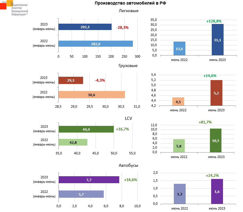 По сравнению же с первым полугодием 2022 года выросло производство легких коммерческих автомобилей и автобусов, на 16,7% и 34,6% соответственно. Производство легковых автомобилей сократилось на 28,3% , производство грузовых - на 4,3%. Если же сравнивать результаты за июнь текущего года с аналогичным периодом прошлого года, то производство всех типов автомобилей выросло.