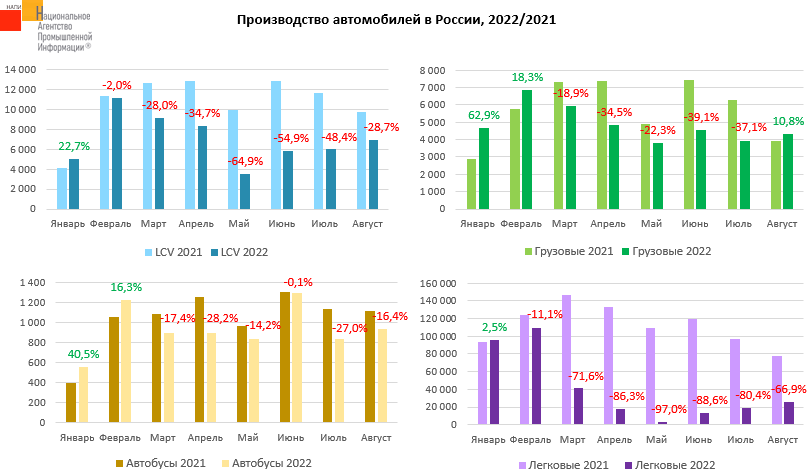 Согласно данным НАПИ (Национальное Агентство Промышленной Информации) в августе текущего года было произведено 4,3 тыс. грузовых автомобилей, тогда как в августе прошлого года с конвейеров сошло 3,9 тыс. грузовиков. Производство остальных видов техники в августе по сравнению с прошлым годом сократилось, но по сравнению с июлем текущего года выпуск лёгких коммерческих автомобилей вырос на 15,3%, автобусов - на 12,4% , легковых автомобилей – на 35,7%. Выпуск грузовиков в августе по сравнению с июлем вырос на 9,6%. Всего за 8 месяцев текущего года было произведено 38,9 тыс. грузовиков (-15,2% по сравнению с аналогичным периодом прошлого года) , 326,8 тыс. «легковушек» (-63,7%), 55,7 тыс. легких коммерческих автомобилей ( - 34,3%) и 7,5 тыс. автобусов ( - 10,1%).