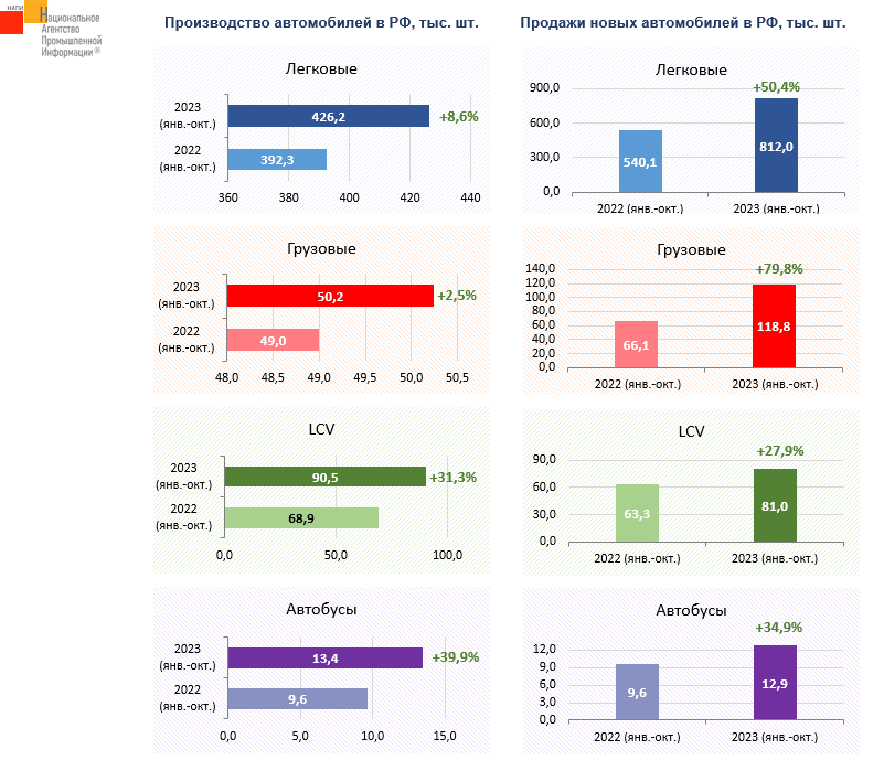 Маркетинговое агентство НАПИ проанализировало данные по производству и продажам новых автомобилей за 10 месяцев 2023 г. Производство легковых автомобилей по сравнению с январем-октябрем прошлого года выросло на 8,6%, тогда как рынок легковых автомобилей - на 50,4%. Продажи новых грузовиков взлетели на 79,8%, производство же грузовой техники выросло лишь на 2,5%. Такая ситуация в сегментах легковых и грузовых автомобилей вызвана в первую очередь бурным ростом импорта китайской техники. В сегменте LCV и в сегменте автобусов производство росло быстрее продаж.