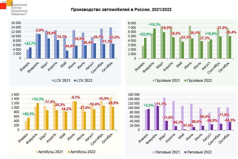 Согласно данным НАПИ (Национальное Агентство Промышленной Информации) за 10 месяцев текущего года было произведено 392,1 тыс. «легковушек» (-64,5% по сравнению с аналогичным периодом прошлого года), 49 тыс. грузовиков (-18,0%) , 68,9 тыс. легких коммерческих автомобилей ( - 38,7%) и 9,6 тыс. автобусов ( - 13,5%). Следует отметить, что с июня производство легковых автомобилей растет по отношению к предыдущему месяцу.