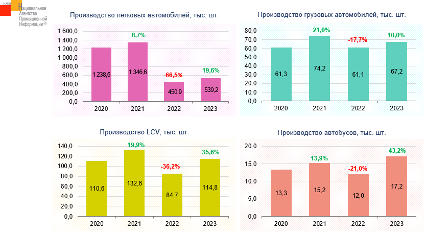 По данным маркетингового агентства НАПИ, производство легковых автомобилей в 2023 г. упало по сравнению с «ковидным» 2020 годом на 56,5%. По сравнению же с 2022 годом выпуск легковых автомобилей вырос на 19,6%. Производство легких коммерческих автомобилей, грузовых автомобилей и автобусов превзошло показатели «ковидного» года и 2022 года. По темпам роста лидирует производство автобусов.