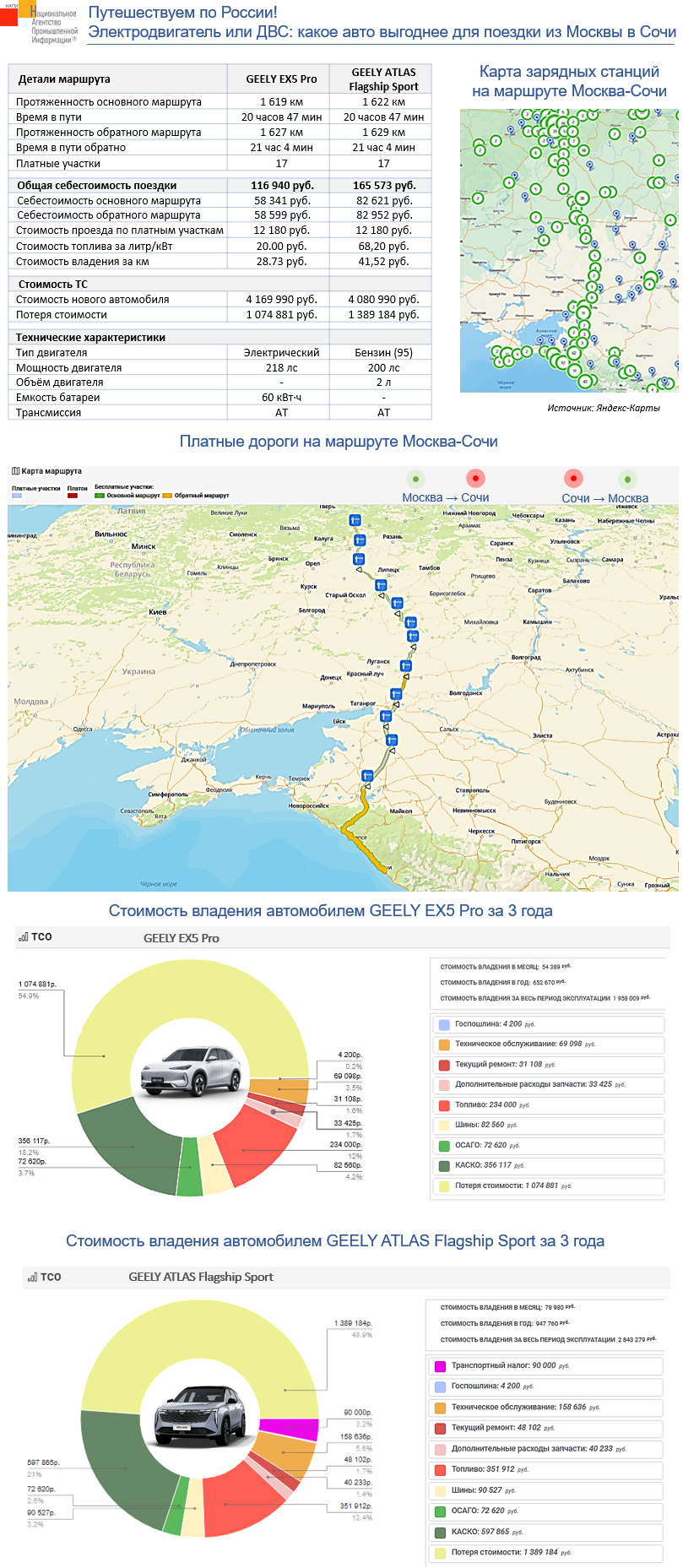 🌟 Отправим по одному и тому же маршруту электромобиль GEELY EX5 Pro и бензиновый автомобиль GEELY ATLAS Flagship Sport. На маршруте есть достаточное количество как АЗС, так и ЭЗС. Оба транспортных средства зарегистрированы в Москве, приобретались за собственные средства. Владелец — физическое лицо возрастом 30-34 года со стажем вождения 10-14 лет. Срок владения автомобилем 3 года, а среднегодовой пробег – 20 тыс. км.