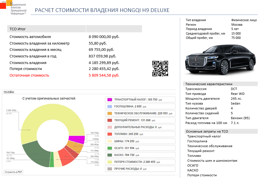 Маркетинговое агентство НАПИ (Национальное Агентство Промышленной Информации) произвело расчет стоимости владения автомобилем HONGQI H9 Deluxe.