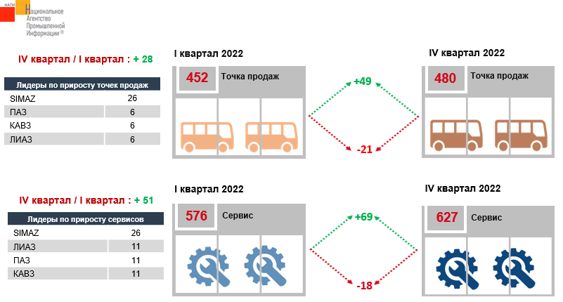 По данным НАПИ количество точек продаж автобусов в четвертом квартале 2022 г. выросло на 28 по сравнению с первым кварталом. В 4 квартале текущего года насчитывается 480 точек продаж автобусов. Количество сервисных центров по обслуживанию автобусов увеличилось на 51. Более всего нарастили дилерскую и сервисную сеть марки ПАЗ, КАВЗ, ЛИАЗ.