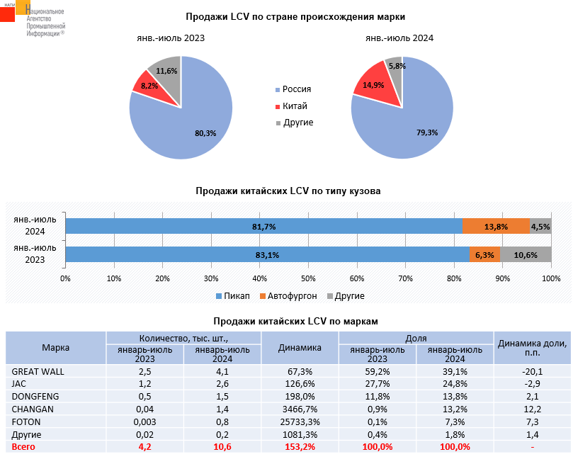 Маркетинговое агентство НАПИ проанализировало продажи китайской техники в сегменте новых легких коммерческих автомобилей (LCV)*. По итогам января-июля 2024 г. китайские бренды заняли почти 15% рынка. Помимо традиционных пикапов китайские производители стали активнее выводить на рынок фургоны, доля которых достигла почти 14% от проданных китайских LCV. Самыми популярными марками среди китайской техники остались GREAT WALL и JAC.