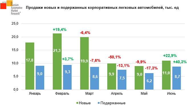 Согласно данным НАПИ (Национальное Агентство Промышленной Информации) продажи подержанных легковых автомобилей корпоративным клиентам оказались устойчивее, чем продажи новых. Сильнее всего относительно предыдущего месяца продажи подержанной техники сократились в мае 2022 г. (-17,3% относительно апреля). В сегменте новых легковых автомобилей в апреле 2022 г. продажи рухнули на 50,1% относительно марта. В июне продажи новой и подержанной техники корпоративным клиентам начали восстанавливаться. На фоне дефицита новых автомобилей у корпоративных клиентов растет интерес к «свежим» подержанным автомобилям, продажи которых в июне приблизились к показателям января - февраля текущего года. Если учесть, что на рынок выходят бывшие в употреблении автомобили различных брендов от компаний, сокративших или остановивших свою деятельность в России, можно ожидать, что спрос на подержанные автомобили со стороны корпоративных клиентов сохранится.