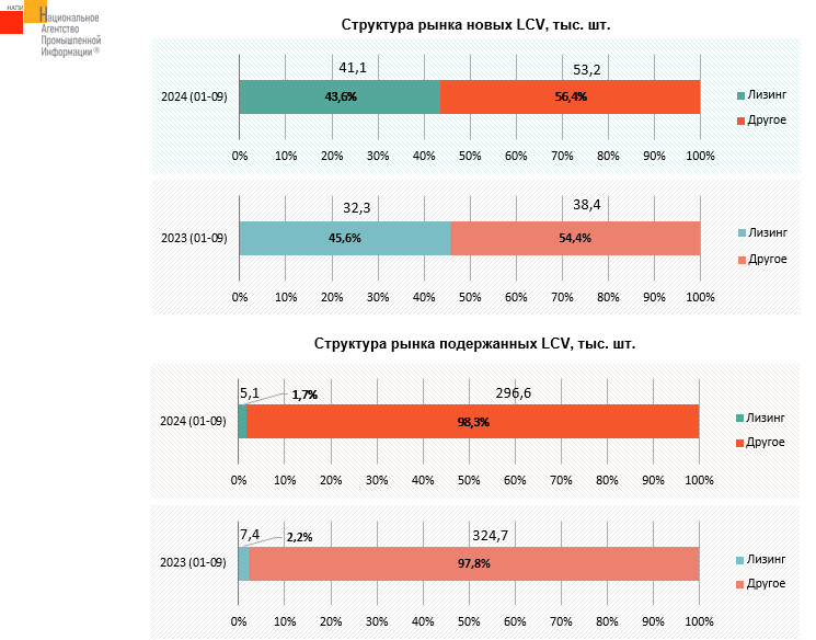 По данным маркетингового агентства НАПИ, за девять месяцев 2024 года в финансовый и операционный лизинг было выдано 46,1 тыс. новых и подержанных легких коммерческих автомобилей (LCV)*, что на 16,5% больше чем в январе-сентябре прошлого года. На рынке новых LCV по итогам девяти месяцев 2024 года доля лизинговых автомобилей немного снизилась, за счет более быстрых темпов роста рынка. На рынке подержанной техники доля лизинговых LCV снизилась до 1,7%.
