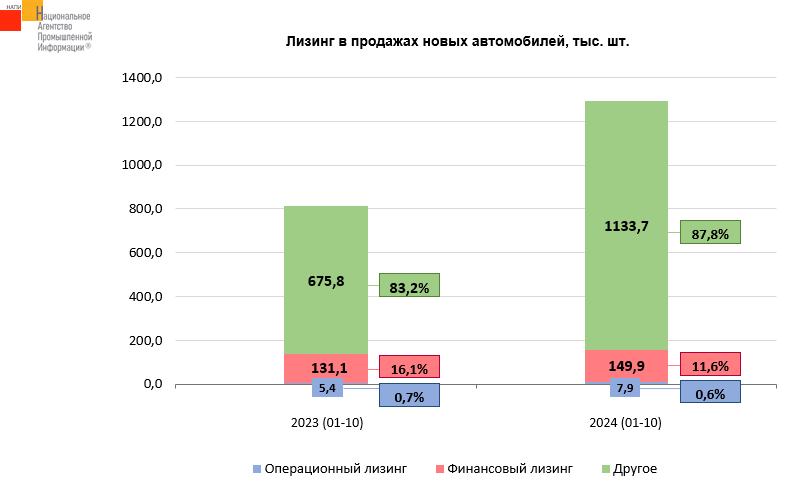 По данным маркетингового агентства НАПИ, за десять месяцев 2024 года в финансовый и операционный лизинг было выдано 157,8 тыс. новых легковых автомобилей, что на 15,6% больше, чем годом ранее. В тоже время рынок новых легковых автомобилей вырос на 59%, в результате доля лизинговых автомобилей на рынке сократилась до 12,2%.