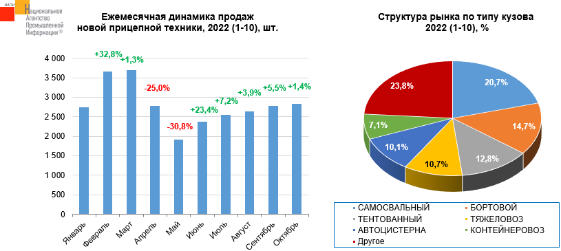 По данным НАПИ, за десять месяцев 2022 г. было продано 28 тыс. ед. новой прицепной техники. Продажи новых прицепов-полуприцепов ежемесячно росли с июня 2022 года. На долю самосвальной техники по итогам января-октября приходится пятая часть рынка новых прицепов-полуприцепов.