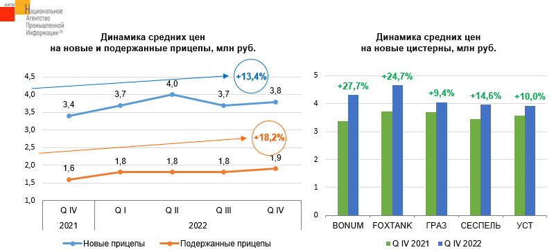 Маркетинговое агентство НАПИ проанализировало цены на новые и подержанные прицепы и полуприцепы. В четвертом квартале 2022 г. средняя цена нового прицепа* по сравнению с четвертым кварталом 2021 г. выросла на 13,4% и достигла 3,8 млн. руб., против 3,4 млн. руб. годом ранее. Рост цен на подержанные прицепы* был более ощутимым (+18,2%). В четвертом квартале прошлого года средняя цена на подержанные прицепы составила 1,9 млн. руб., годом ранее – 1,6 млн. руб. Если же сравнивать средние цены с третьим кварталом 2022 г., то в четвертом квартале прошлого года средняя цена на новую прицепную технику увеличилась на 2,3%, средняя цена на подержанную технику - на 2,7%.