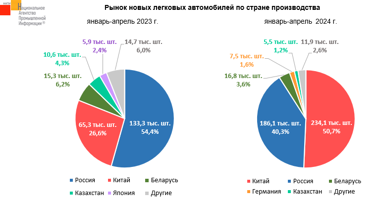 Маркетинговое агентство НАПИ проанализировало, как изменился рынок новых легковых автомобилей по стране производства по итогам января-апреля 2024 г. Несмотря на рост продаж автомобилей, произведенных в России, их доля за год существенно снизилась. Если в прошлом году автомобили российского производства занимали более половины рынка, то теперь на их долю приходится 40,3%. А вот доля автомобилей, произведенных в Китае, за год выросла с 26,6% до 50,7%. Пока, как мы видим, китайские автоконцерны не спешат разворачивать производство в России, а наращивают импорт, в т.ч. и ушедших из России брендов. Так за год продажи произведенных в Китае автомобилей TOYOTA выросли на 241%, продажи «китайских» автомобилей MAZDA – на 189%.