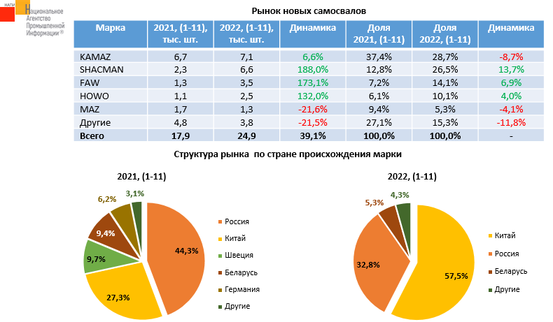 По данным маркетингового агентства НАПИ продажи новых самосвалов за 11 месяцев текущего года выросли на 39,1%. Китайская техника заняла 57,5% рынка новых самосвалов в текущем году, тогда как в прошлом году российские производители преобладали на рынке, их совокупная доля составляла 44,3%. В личном зачете КАМАЗ по-прежнему занимает первое место на рынке новых самосвалов.