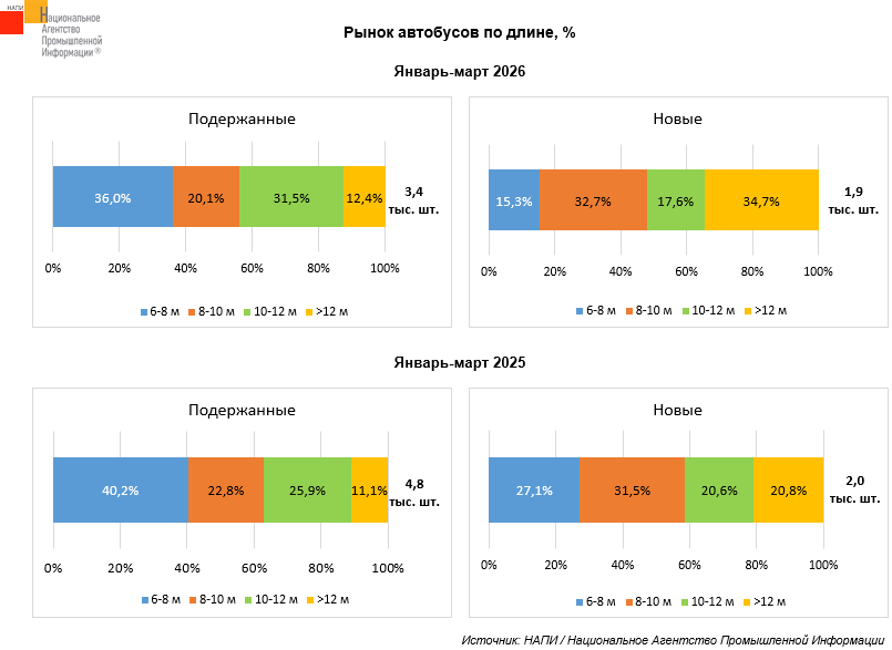 Среди новой техники увеличилась доля автобусов длиной 8-10 м (+1,2 п.п.) и более 12 м (+13,9 п.п.), сократилась доля автобусов длиной 6-8 м (-11,8 п.п.) и 10-12 м (-3,0 п.п.). Наибольшая доля в продажах новой техники в январе-марте 2026 года приходится на автобусы длиной более 12 м (34,7%) и 8-10 м (32,7%).