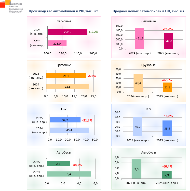 Маркетинговое агентство НАПИ проанализировало данные по производству и продажам новых автомобилей в январе-апреле 2025 г.