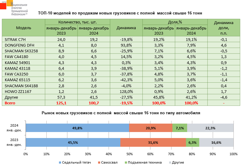 По данным маркетингового агентства НАПИ, по итогам 2024 года было продано 100,7 тыс. новых «тяжелых» грузовых автомобилей (с полной массой свыше 16 т). По сравнению с 2023 годом рынок тяжелых грузовиков сократился на 19,5%. Изменилась и структура рынка, существенно сократилась доля самосвалов (на 10,7 п.п.), доля тягачей увеличилась на 4,3 п.п. Лидером на рынке тяжелых грузовиков в 2024, как и в 2023 году, стал SITRAK C7H.