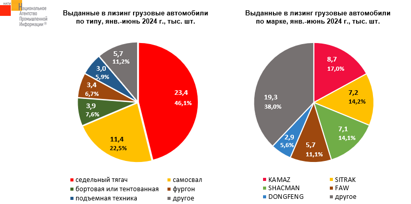 По данным маркетингового агентства НАПИ, за первое полугодие 2024 года в финансовый лизинг было выдано 50,8 тыс. новых и подержанных грузовых автомобилей. На долю седельных тягачей пришлось 46,1% лизинговых грузовиков, на долю самосвалов – 22,5%. Больше всего в лизинг выдавалось грузовых автомобилей KAMAZ (17% ), на втором месте - грузовики SITRAK с долей 14,2%.