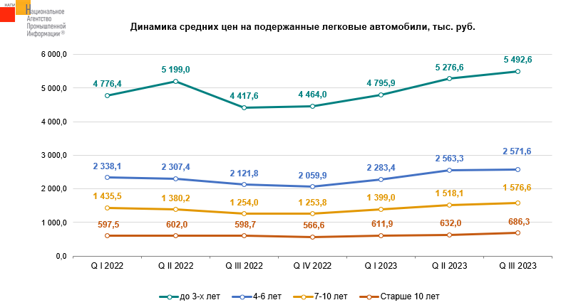 Маркетинговое агентство НАПИ (Национальное Агентство Промышленной Информации) проанализировало динамику средних цен на подержанные легковые автомобили с 1 квартала 2022 года по 3 квартал 2023 года. Средние цены на подержанные автомобили всех возрастных групп в 3 квартале текущего года по сравнению со вторым кварталом выросли. Больше всего подрожали автомобили старше 10 лет* (+8,6%), на втором месте по темпам роста «свежие» подержанные (до 3 лет), средние цены на которые увеличились на 4,1%. Автомобили возрастом 7-10 лет подорожали на 3,9%, меньше всего выросли цены на машины возрастом 4-6 лет (+0,3%).