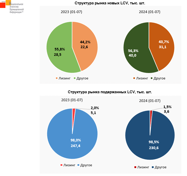 По данным маркетингового агентства НАПИ, за семь месяцев 2024 года в финансовый и операционный лизинг было выдано 34,7 тыс. новых и подержанных легких коммерческих автомобилей (LCV), что на 25,2% больше чем в январе-июле прошлого года. На рынке новых LCV по итогам семи месяцев 2024 года доля лизинговых автомобилей немного снизилась, за счет более быстрых темпов роста рынка. Тем не менее доля лизинговых LCV насчитывала 43,7%, что является хорошим показателем, принимая во внимание, что в 2024 году под программы льготного лизинга попадают не все LCV, а только микроавтобусы и техника с электрическим двигателем. На рынке подержанной техники доля лизинговых LCV снизилась до 1,5%.