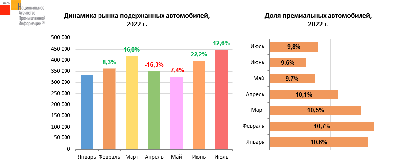 Согласно данным НАПИ (Национальное Агентство Промышленной Информации), на рынке подержанных автомобилей сократилась доля премиальных брендов. С января по апрель текущего года доля премиальных автомобилей колебалась на уровне 10,1-10,7%, с мая по июль продажи премиальных автомобилей не дотягивали до 10%. Если рассматривать весь рынок подержанных автомобилей в 2022 году, то самым провальным месяцем стал май, когда было продано 326 тыс. подержанных автомобилей, что чуть меньше результата января текущего года. В июне-июле продажи подержанных автомобилей начали восстанавливаться. В июле было продано наибольшее количество бывших в употреблении автомобилей (448,6 тыс.) с начала года.