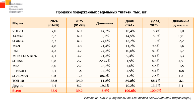 По данным маркетингового агентства НАПИ, в январе-августе 2025 года было продано 39,2 тыс. подержанных седельных тягачей, что на 8,6% меньше, чем за аналогичный период 2024 года. При этом продажи новых тягачей упали сильнее: с 33,9 тыс. единиц до 9,9 тыс. единиц (-70,8%).