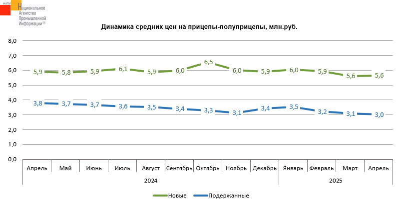 Маркетинговое агентство НАПИ проанализировало динамику средних цен на новые и подержанные* прицепы-полуприцепы. За месяц, с марта 2025 по апрель 2025 года, средняя цена на новую прицепную технику увеличилась на 0,6%, средняя цена на подержанную прицепную технику снизилась на 2,2%.