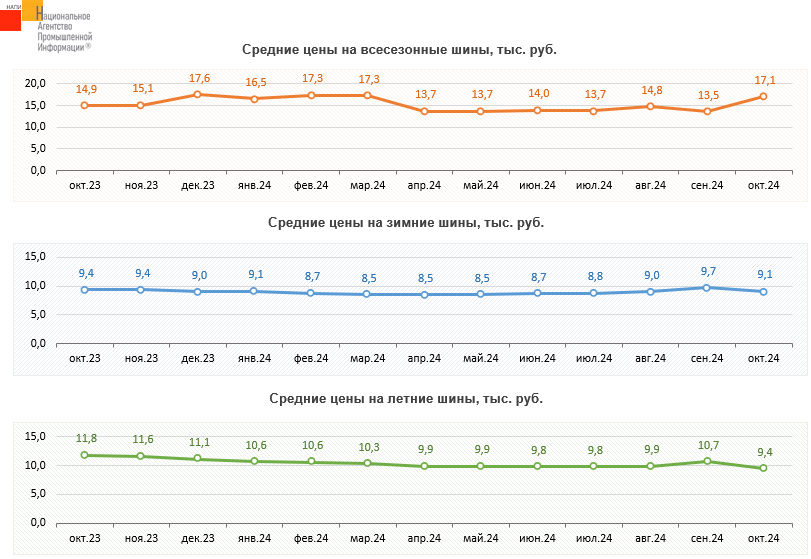 Маркетинговое агентство НАПИ проанализировало динамику средних цен на новые шины не премиального ценового сегмента для легковых автомобилей. За один месяц (с сентября 2024 по октябрь 2024 года) всесезонные шины подорожали на 26,3%, цены на зимние шины снизились - на 6,4%, летние шины подешевели на 11,6%.